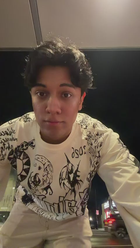 Crafted in an off-white vintage wash, the sweatshirt features hand-drawn, bold typography, and a distressed raw-hem finish that gives every piece an authentic worn-in look. The oversized silhouette and long sleeves deliver effortless streetwear appeal, perfect for layering or wearing solo.